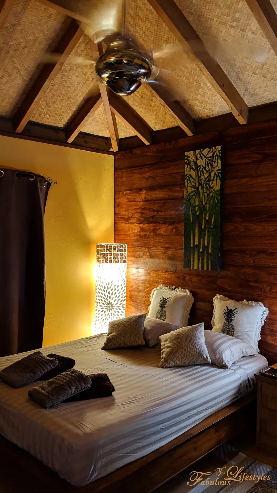 The room itself isn't huge, but it has soaring high ceilings crafted from beautiful woven rattan material — giving it such a warm, tropical character~