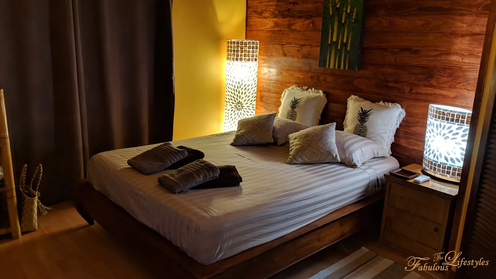 The interior is decorated in rich, warm wood tones throughout, complemented by pineapple-print throw pillows made right here on Moorea. That local touch adds so much character to the design!