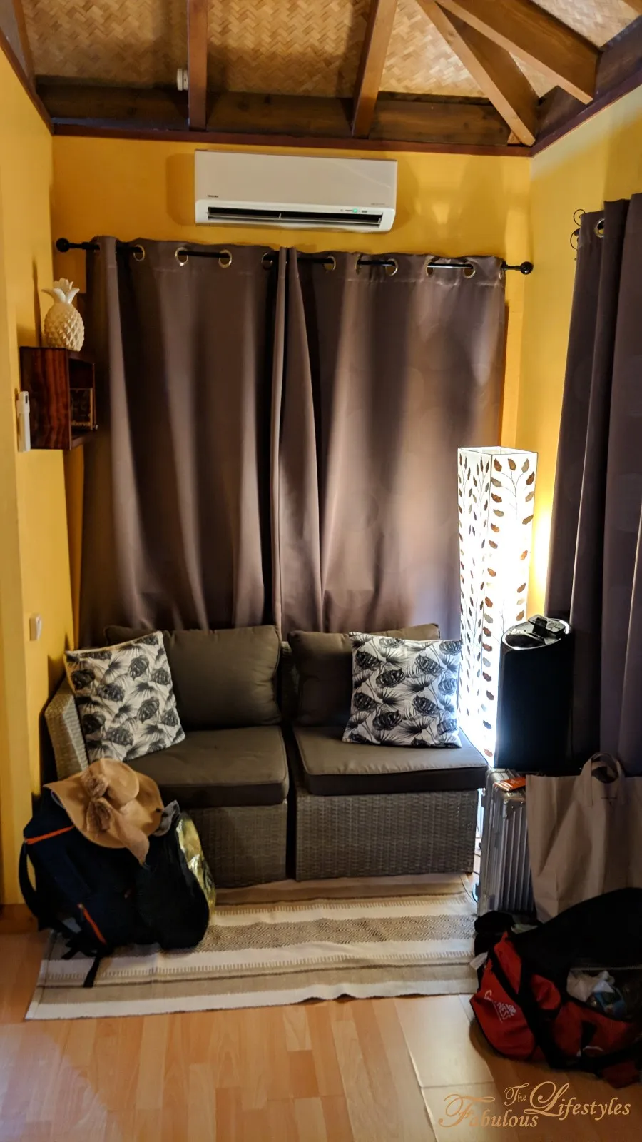 Small as the room is, the host made brilliant use of the space by fitting in a two-person sofa — giving us somewhere cozy to relax beyond just the bed. On the nearby shelf, a fresh pineapple echoed the pineapple pillow motif. Adorable!