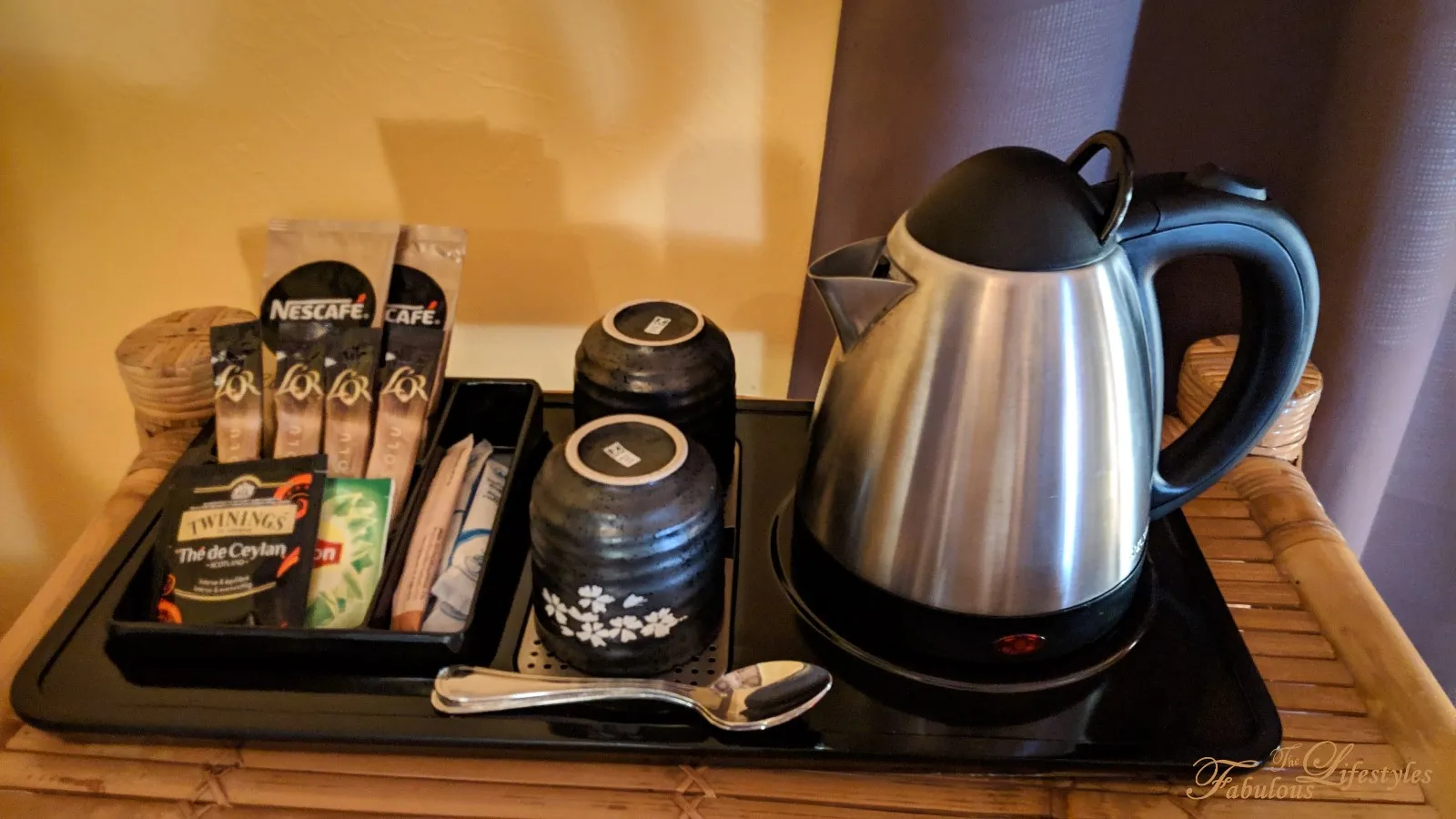 Coffee, tea, and — most importantly — an electric kettle!!!