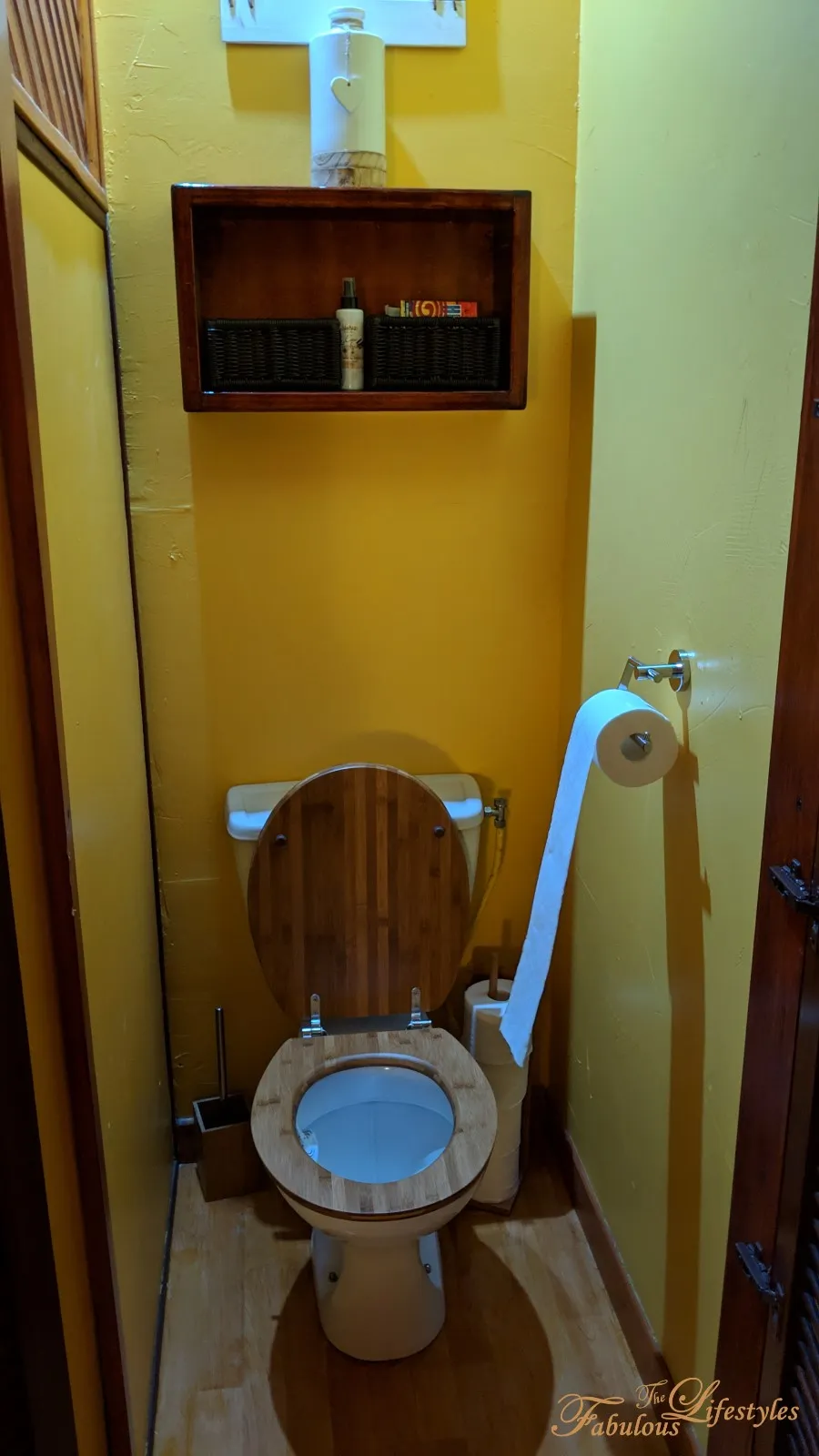 The bathroom has a wonderfully unique design — the ceiling, like the room, is made of woven bamboo, and the shower area features two ventilation windows. Small but oh-so-elegant.