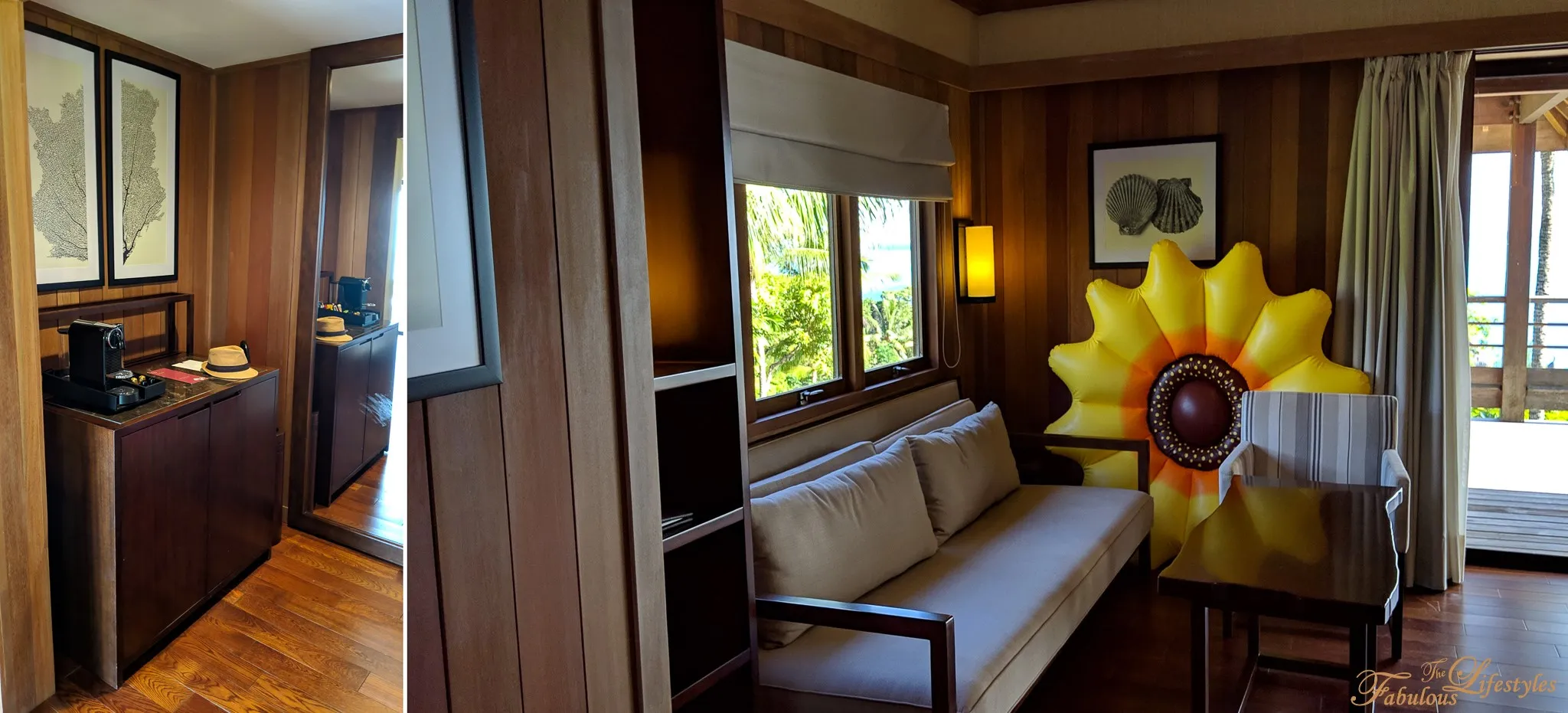 Right as you walk in, the entryway features a cabinet with a coffee maker. Inside the cabinet, there's a mini-fridge and some cups for tea and coffee, along with a kettle and an ice bucket (we actually forgot to take a picture of this because it's so similar to the setup in the overwater bungalows!). Next to the entryway is a cozy sofa~~