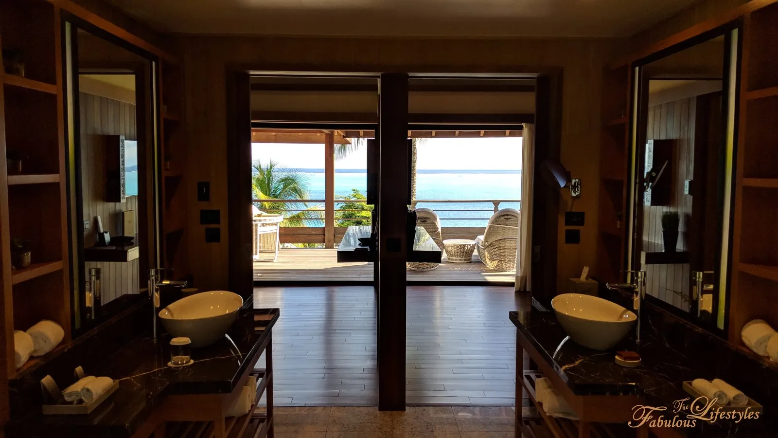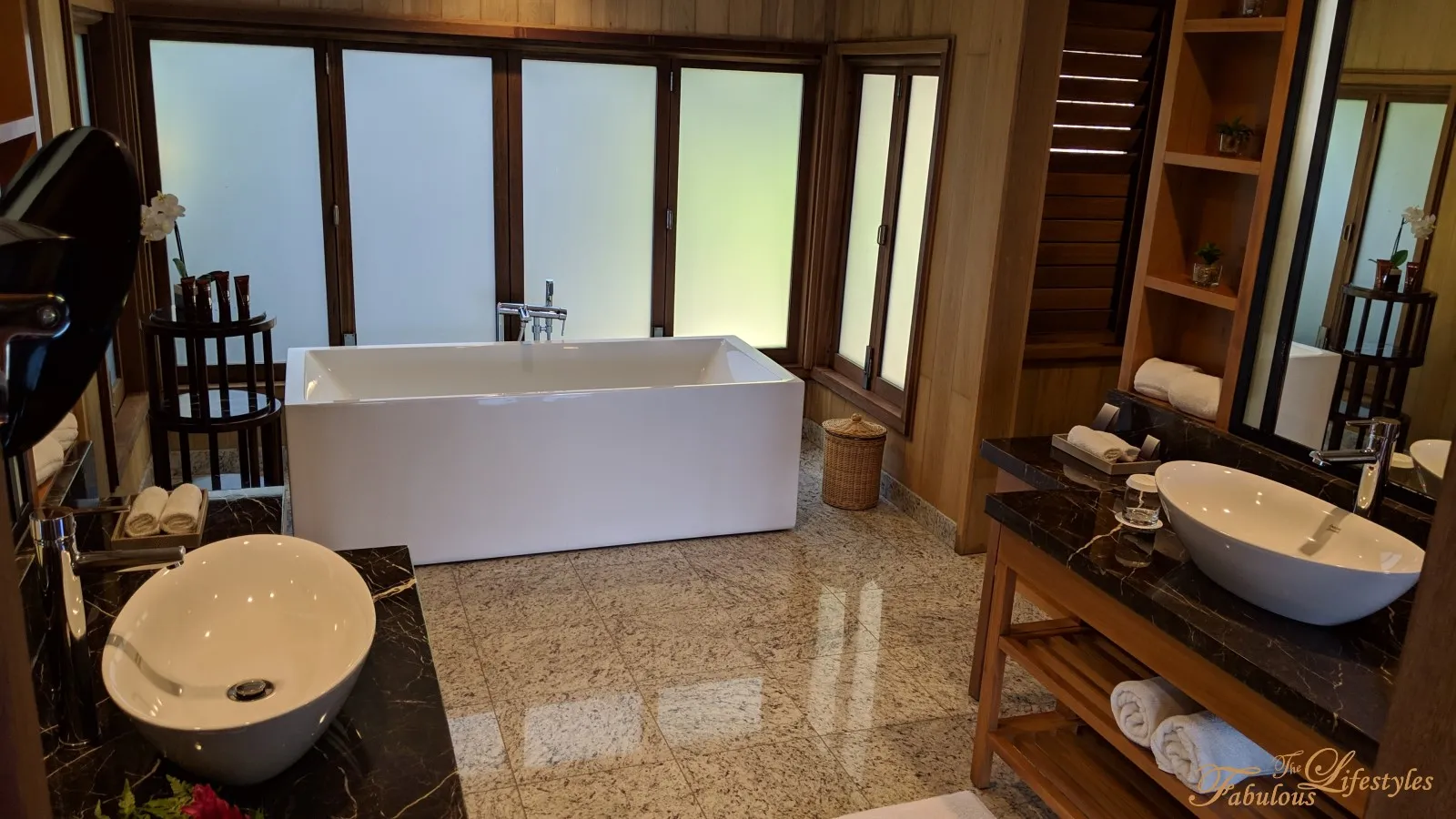 The overall space in the bathroom is slightly smaller than the one in the overwater bungalow, but it still features double vanities and a freestanding bathtub~ The design continues the room's resort cabin style, utilizing a generous amount of natural wood tones.