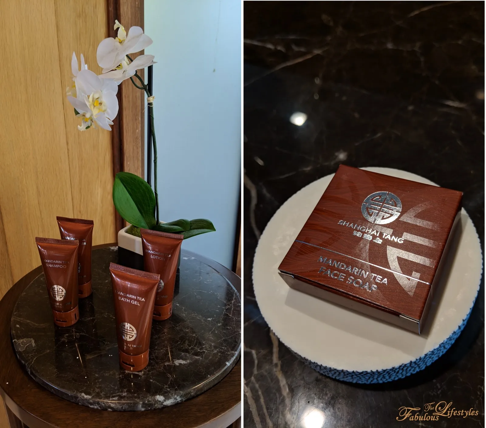 The toiletries provided are the signature "Shanghai Tang" brand used by Hilton's Conrad properties. One small detail we noticed is that the flowers in this suite are artificial orchids~ whereas the overwater bungalows feature fragrant, fresh flowers!