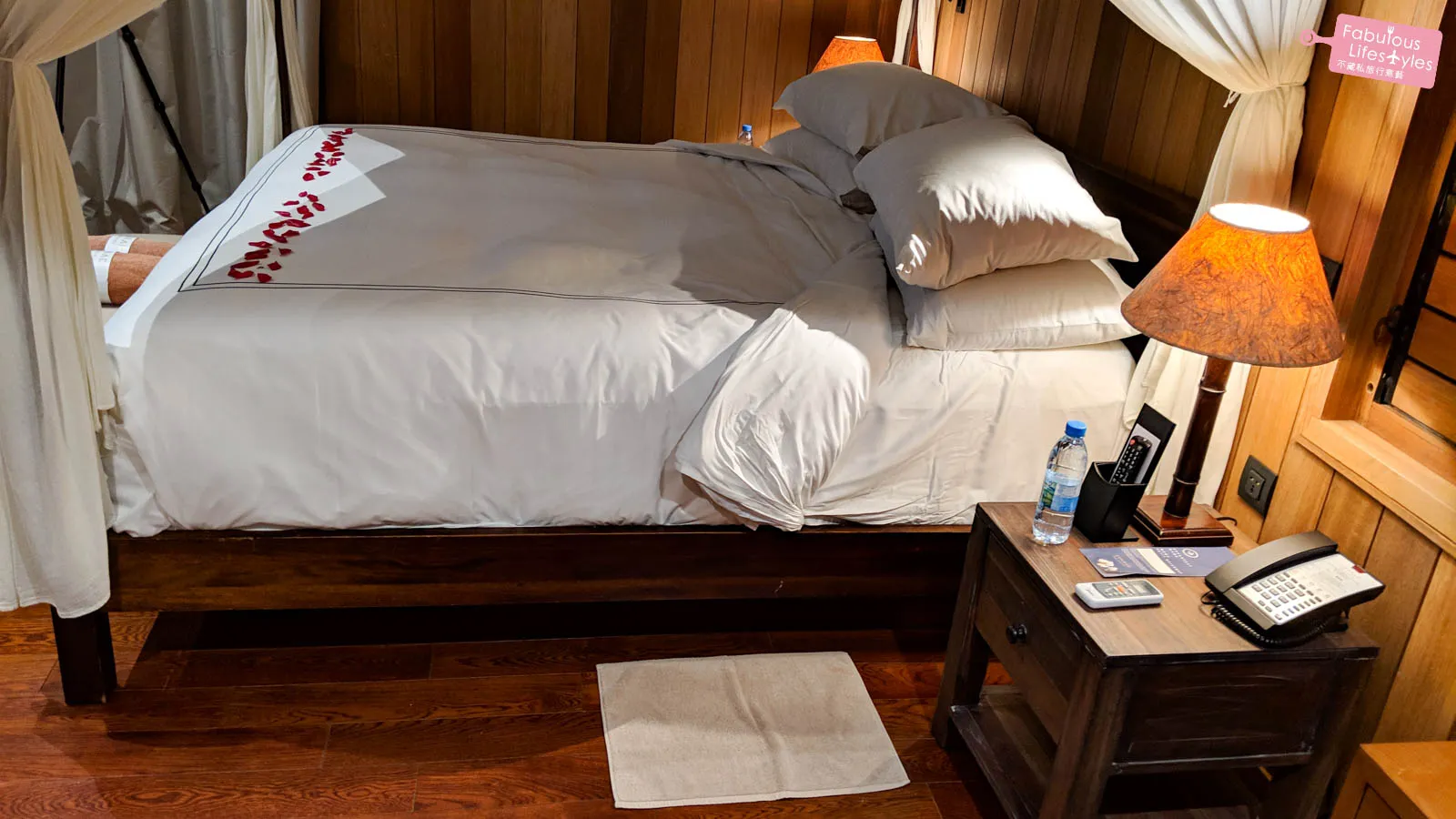 I later noticed that the interior layout of this room is almost exactly the same as the Lagoon View Suite. The only difference is in the materials used—for example, this TV wall is made of wood, whereas the Lagoon View Suite has a white wall. Overall, this room gives off much more of a forest cabin vacation vibe.