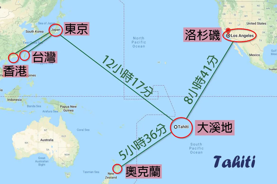 Cherry mapped out the flight times to Papeete, Tahiti from Tokyo, Los Angeles, and Auckland for reference. If you're flying from Taiwan or Hong Kong, you'll need to transit through Tokyo, making the flight from Tokyo to Tahiti about 12+ hours. The shortest flight time is actually from Auckland, New Zealand, which takes just 5.5 hours. Faa'a International Airport (PPT) in Papeete is the only international airport in French Polynesia. So, no matter where you're flying from internationally, you'll land in Papeete first before catching a ferry or an Air Tahiti flight to the other breathtaking islands.