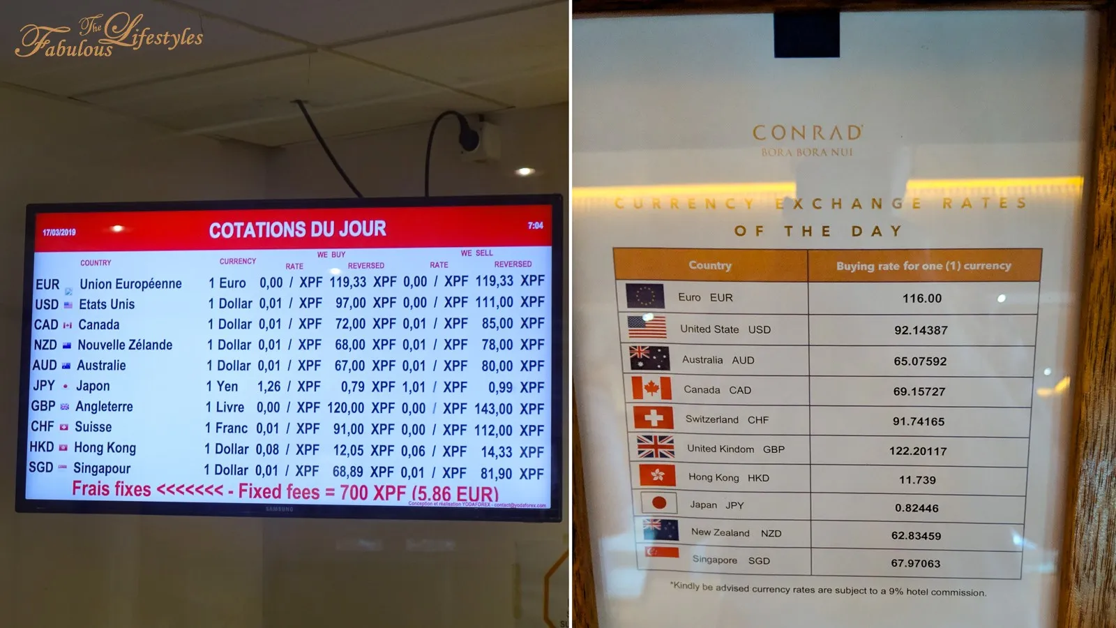 The currency of French Polynesia is the Pacific Franc (XPF). If you need to exchange cash, the easiest way is to do it right at Papeete Airport in Tahiti. Once you grab your luggage and walk out, there's an exchange counter 💱 right on your left. We've compiled a quick comparison of the exchange rates we found: