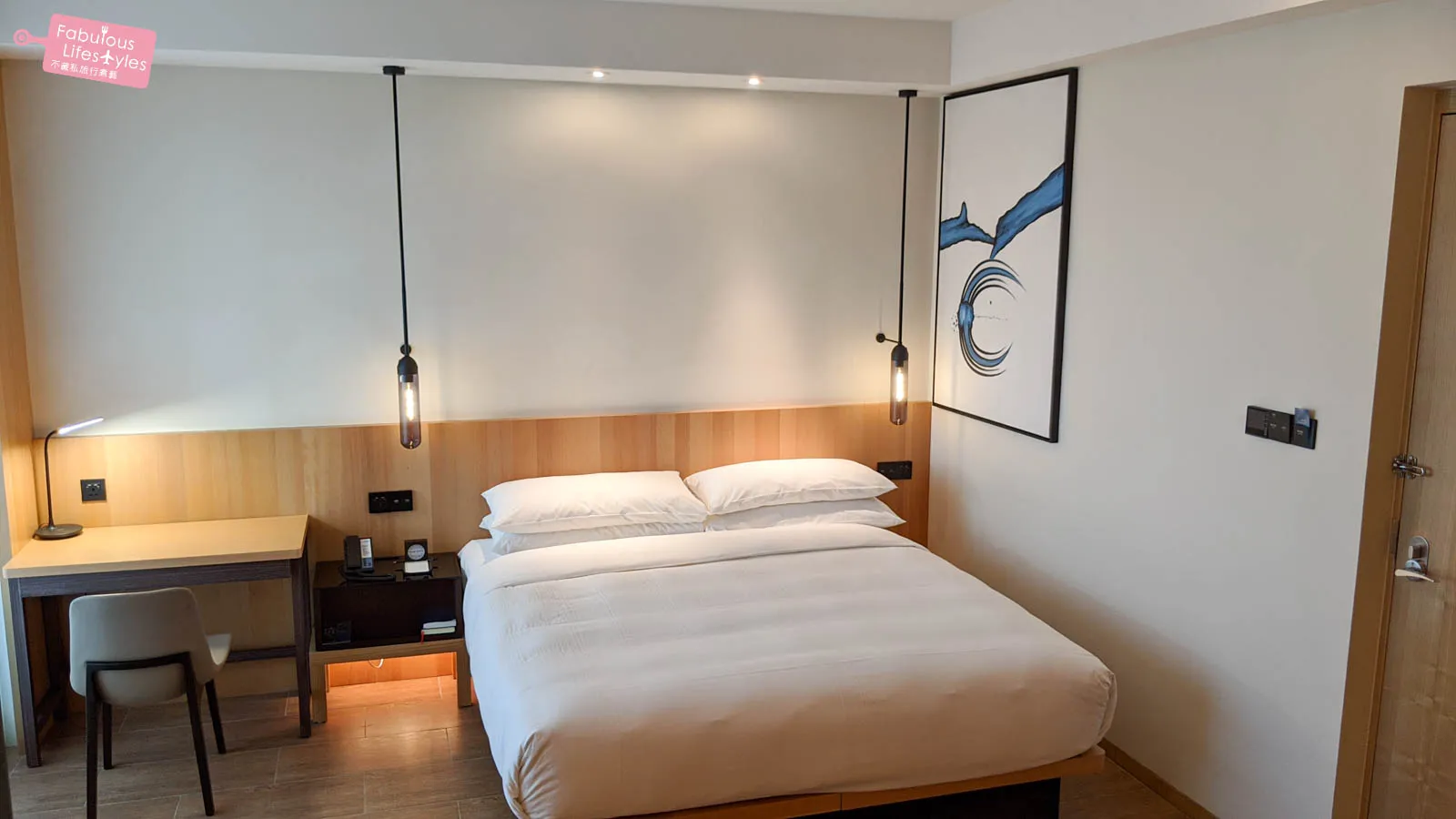 The room’s interior continues the hotel's distinct design theme: warm-toned walls, light wood furniture, and even wood-grain floor tiles. The window frames, pendant lights, sockets, and various hardware are uniformly black, adding a sophisticated, modern contrast to the earthy color palette. For a business hotel, creating such a cozy, home-like atmosphere is a huge plus in our book.