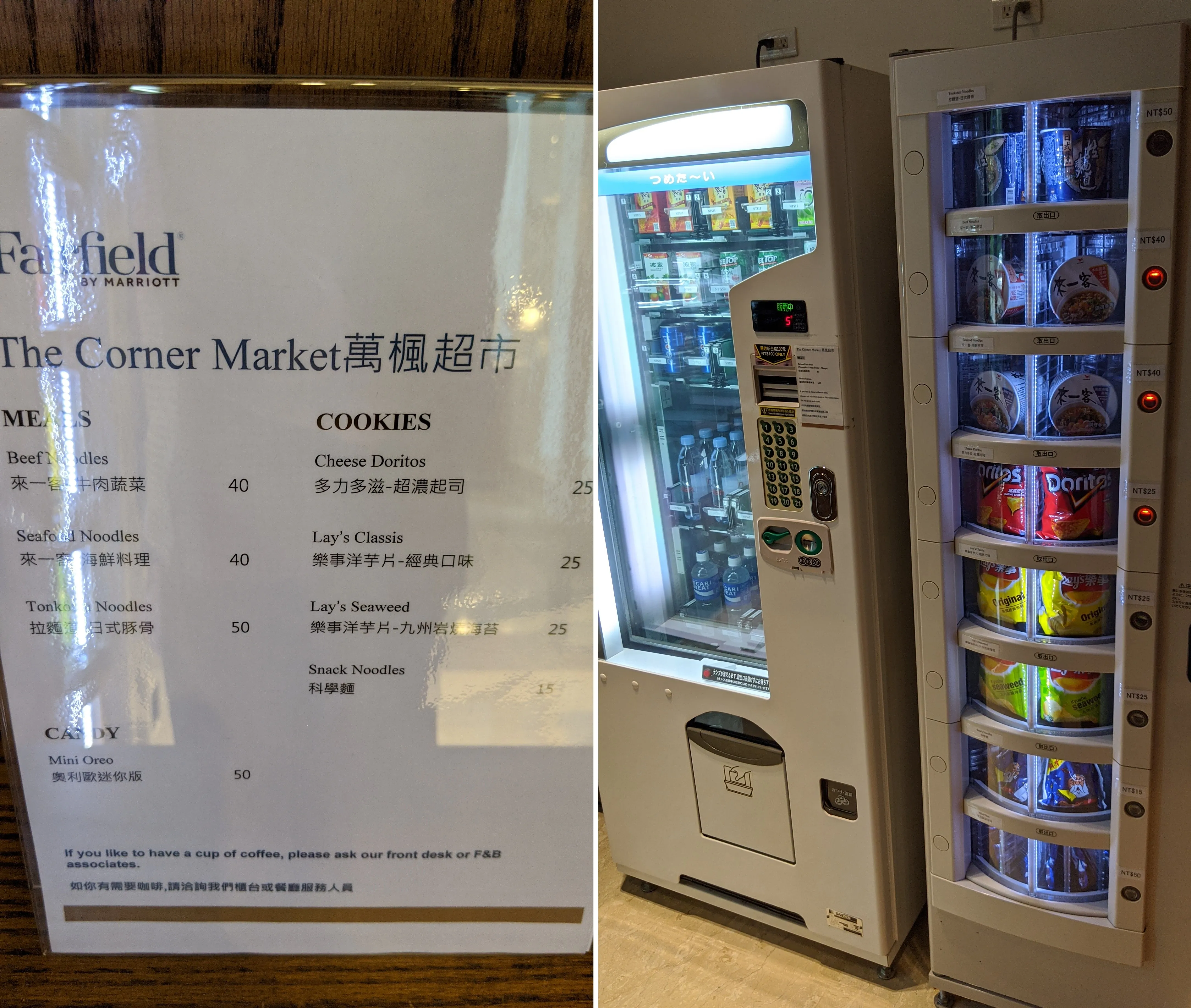 On the 1st floor, The Fairfield Market sells simple snacks, drinks, and souvenirs. The most touching discovery? A vending machine selling instant noodles and classic Taiwanese Prince Noodles (科學麵)! If we ever saw these sold in a hotel abroad, we might just shed a tear of joy! 😆