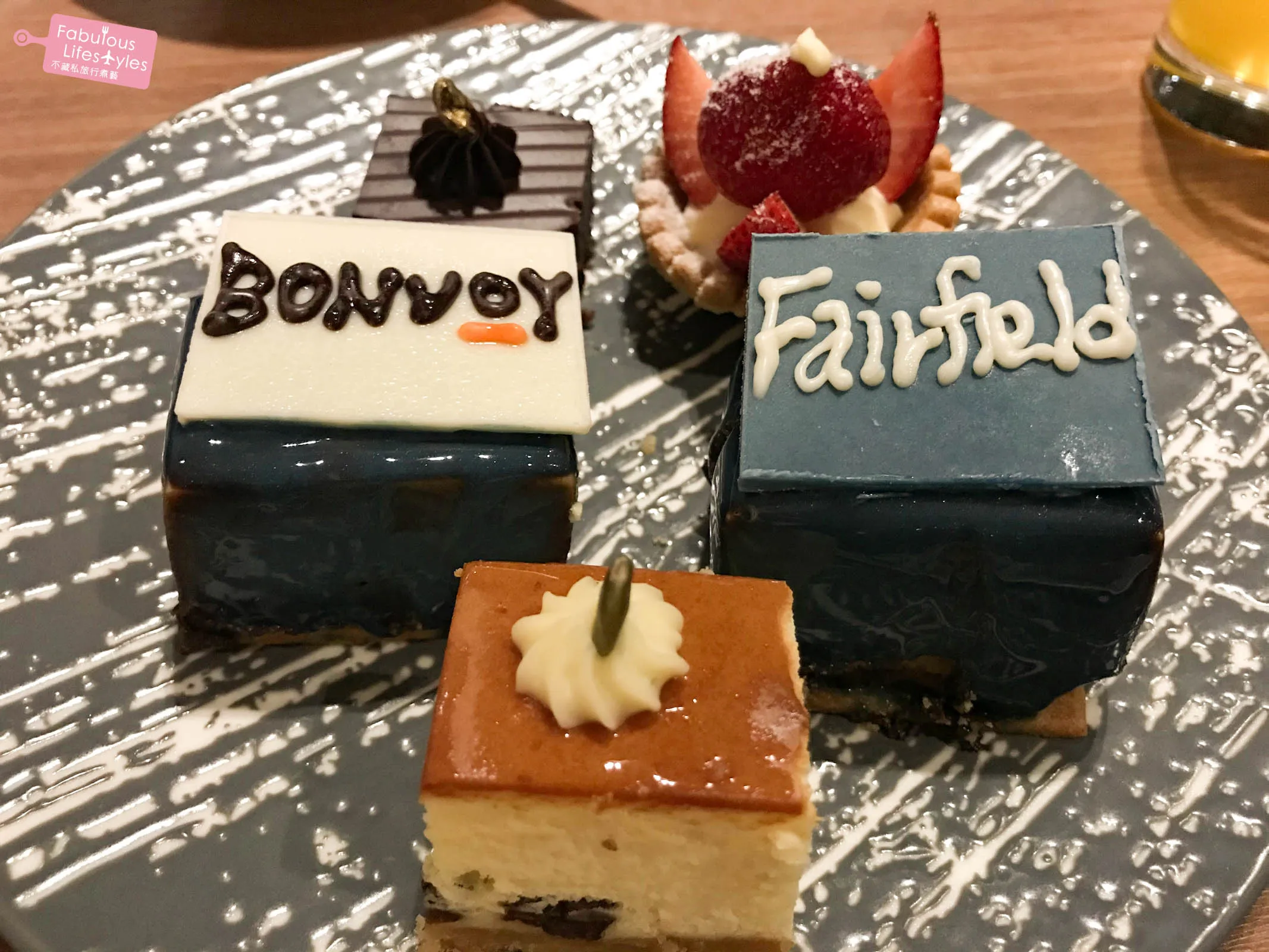 The anniversary cake was a massive "1", surrounded by adorable mini cakes decorated with 'Fairfield', 'Bonvoy', and '1' for guests to grab. Super cute!