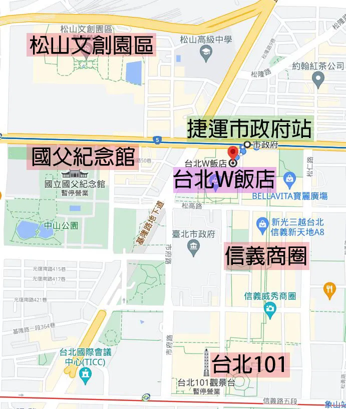 Co-constructed with the Uni-President Department Store, W Taipei boasts an exceptional location. It’s situated right at Exit 2 of the Taipei City Hall MRT station—just take a turn and cross the street, and you’re there! Popular tourist attractions like Taipei 101, Sun Yat-sen Memorial Hall, and Songshan Cultural and Creative Park are all within easy walking distance. If you're in the mood for shopping or catching a movie, the vibrant Xinyi shopping district is right at your doorstep.