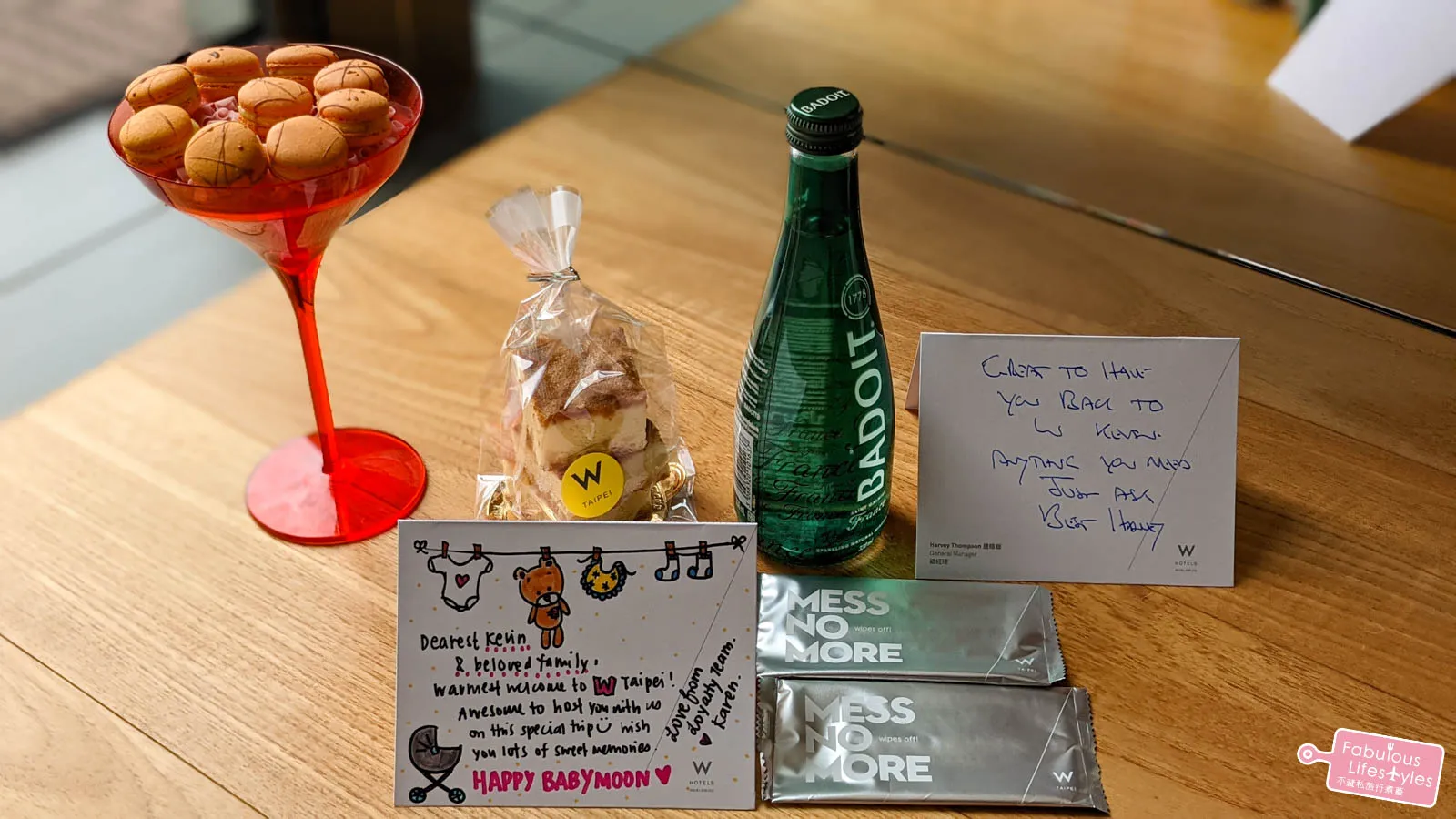 For our "Babymoon," we stayed at 7 different hotels in northern Taiwan, only to be surprised that the concept of a "Babymoon" isn't very common here. Most hotel staff heard "Babymoon" and mistakenly thought it was a baby's one-month birthday! One hotel sent us a birthday cake, while another thoughtfully set up baby amenities in the room (which was still super sweet of them 😆). No exaggeration—W Taipei was the only hotel that knew exactly what a Babymoon was! Their welcome amenity included heartwarming orange-flavored macarons and cake, along with a super, super adorable hand-drawn card!