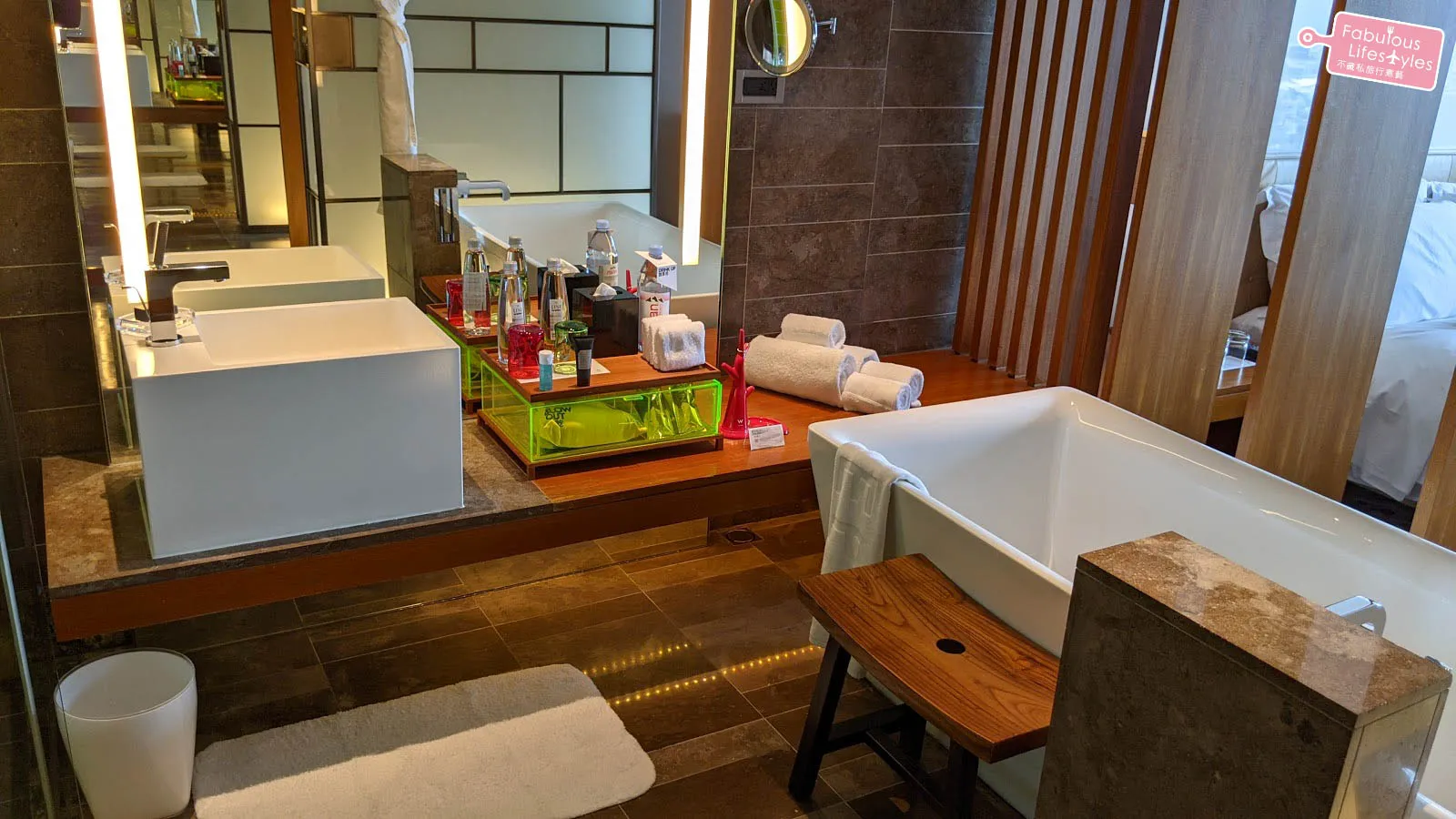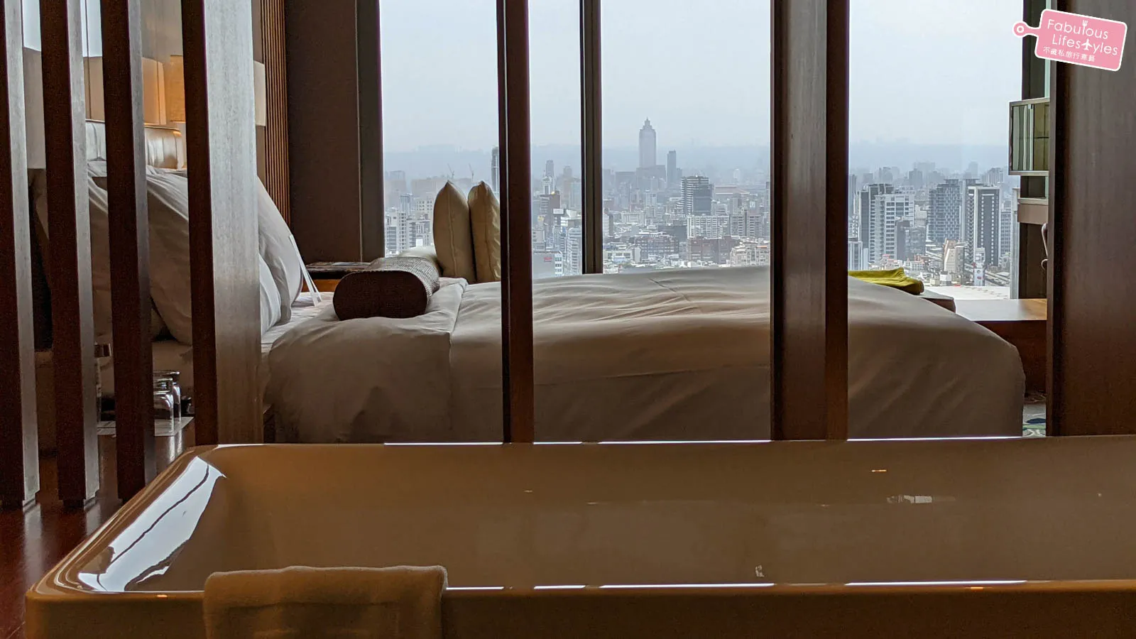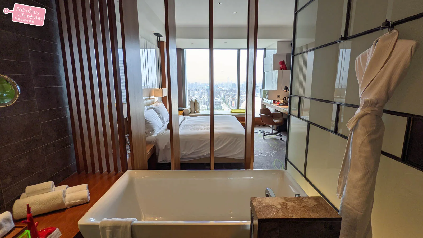 The freestanding bathtub is separated from the guest room by a "rotatable vertical wooden screen," allowing you to look right through to the room and the city view outside while soaking in the tub! The wooden material feels very high-quality. If you want some privacy, you can simply close the screen, and it instantly transforms back into a regular bathroom.