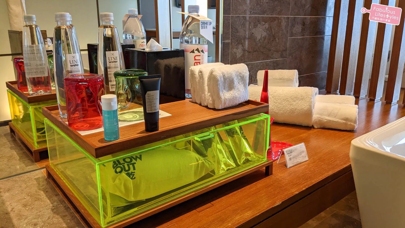 The amenities are displayed in a very unique way—tucked into a bright green, transparent drawer box. On top, they generously laid out bottles of water, towels, rinse cups, tissues, facial cleanser, lotion, and so much more.