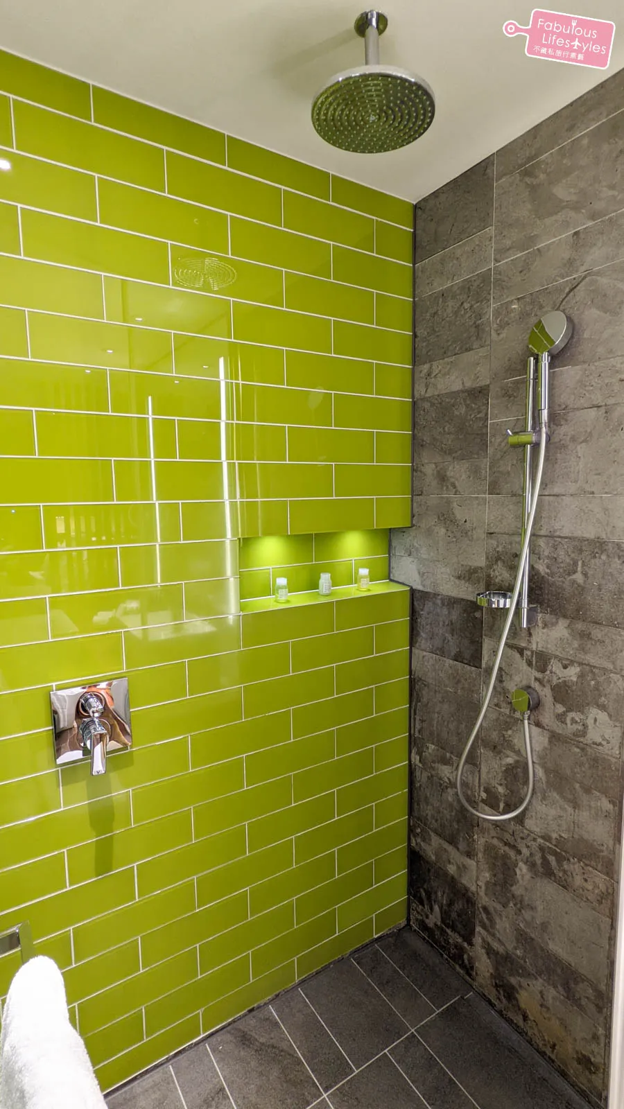 The shower features a very vibrant lime green, and the built-in shelf area even has recessed lighting, which really amps up the luxurious feel!