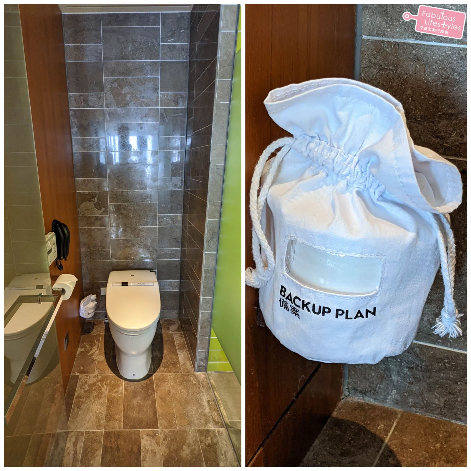The bidet toilet has a sensor that automatically opens the lid, flushes, and closes the lid again. You don't have to touch the toilet from start to finish—it's incredibly convenient! W Hotel injects a bit of humor into a lot of areas, making things very playful. For instance, the spare roll of toilet paper is labeled "Backup Plan." This playful touch felt very similar to our later stay at the Moxy Hotel in Taichung.