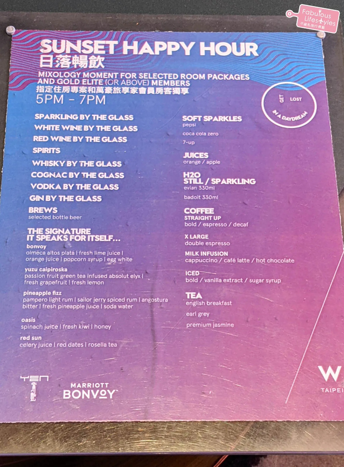 If you are a Marriott Platinum member (or higher) or booked under a specific package, you absolutely cannot miss W Taipei's incredibly generous "Sunset Drinks"! Every day from 5 PM to 7 PM, you can head to either "Woobar on the 10th floor" or "Yen Bar on the 31st floor" to enjoy unlimited selected beverages. It's seriously such a sweet deal!