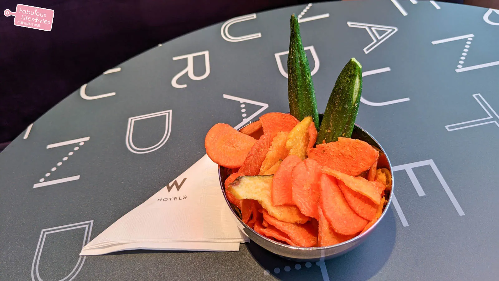 We arrived promptly at 5 PM, and the hotel staff thoughtfully arranged a booth for us. They even brought over some dried vegetable crisps as bar snacks, which were phenomenally good! (We thought we were being restrained, but accidentally devoured two bowls 😂).