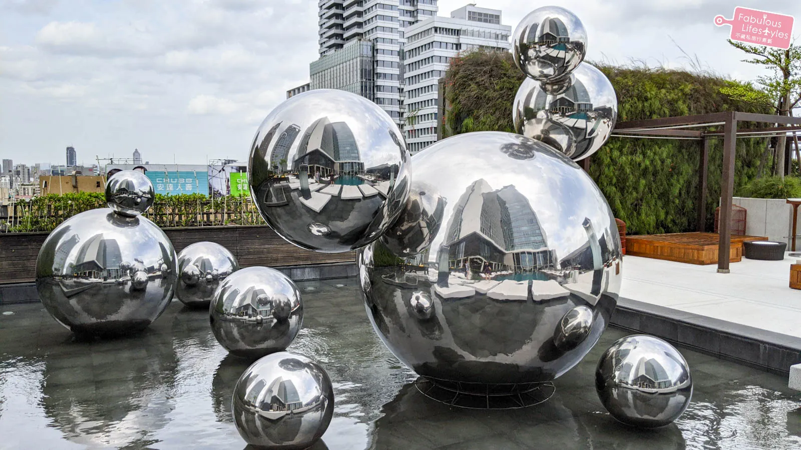 At the far end of the pool sits a massive stainless steel art installation. Get close, and your reflection shines on the metal—it gives off a very similar vibe to Chicago's famous "Cloud Gate" (The Bean)!