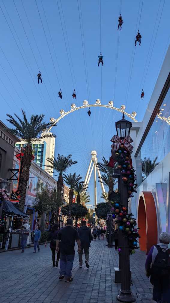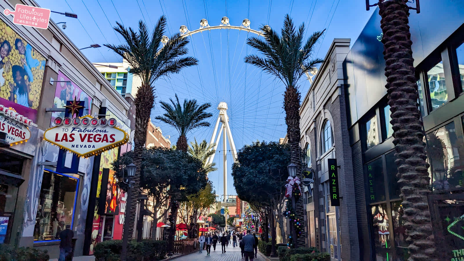 走進凝酷步行街馬上映入眼簾的就是後方那個550英尺高的北美最大摩天輪—「豪客摩天輪」,沿路可以看見整排的棕梠樹,不說真的很難相信這裡地處沙漠!