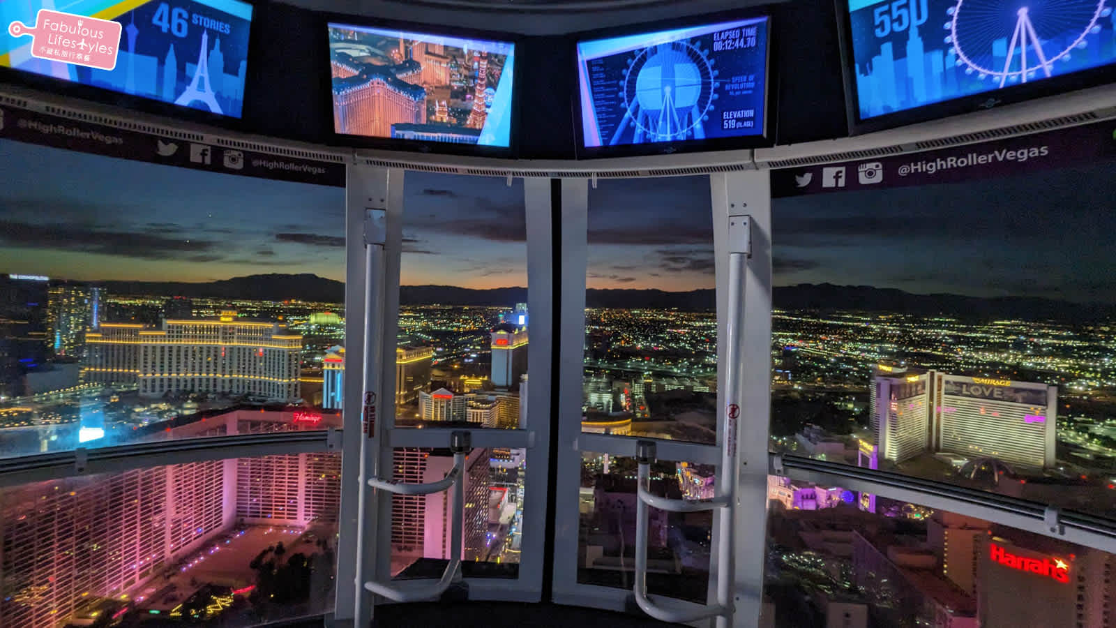 這個「豪客摩天輪」可以從高空超近距離俯瞰2023年才全新開幕的~地表最大球體建築「The Sphere」,在夜空中閃閃發光,不行的在球體上撥放著不同的影片,親眼所見真的超級震撼,絕對是拉斯維加斯必去的景點之一!